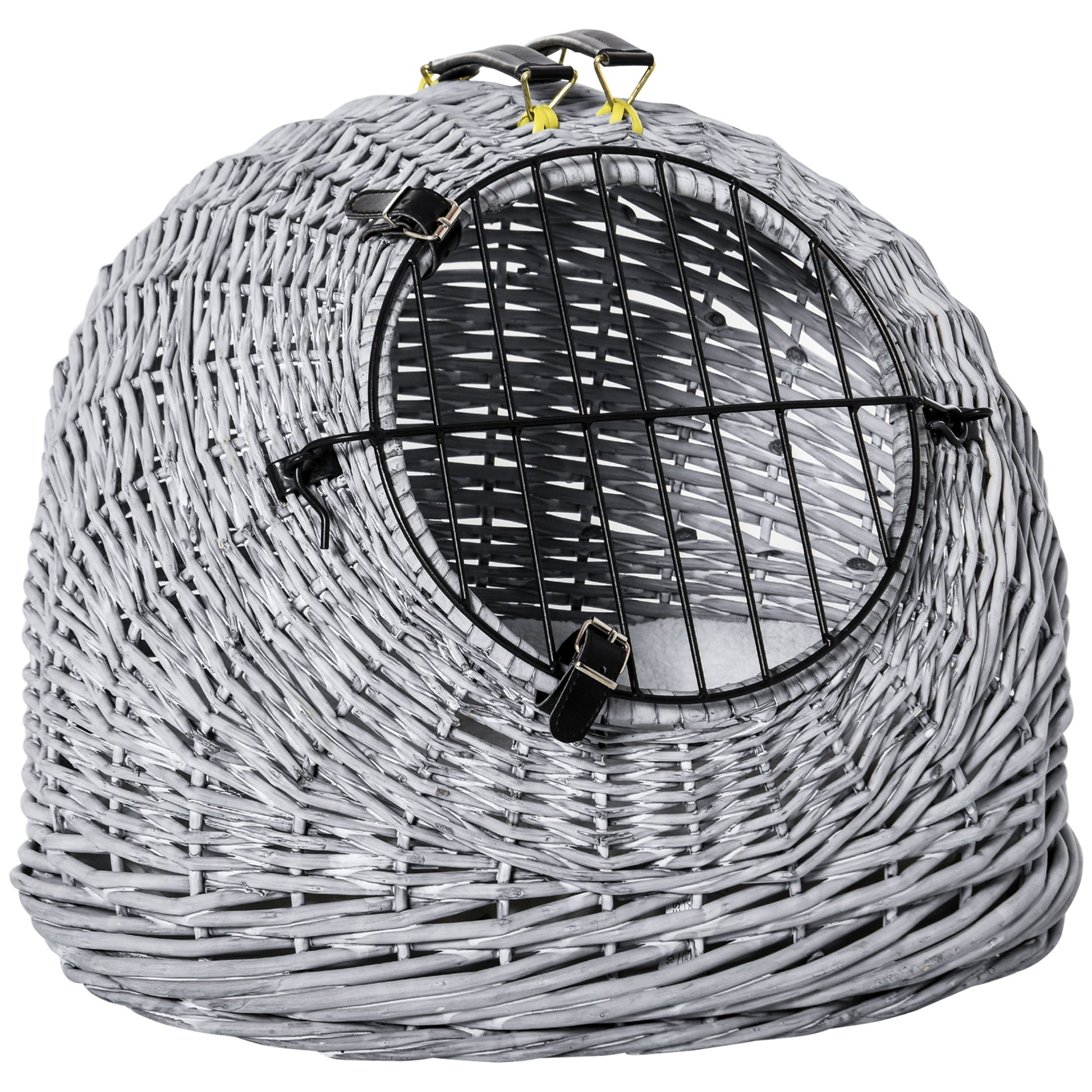 Give your cat the luxurious option when taking them travelling with this basket from PawHut. Mid-grey in colour, the body is made using hand-woven and non-toxic wicker in a spacious semi-round shape, providing a safe shelter for you cat for many years to come, as well as being safe to your pet if they catch their claws. Placed towards the top, a metal wire gate with a buckle fastening keeps your cat/kitten safely and securely in, with a removable fleece-feel cushion for comfort.