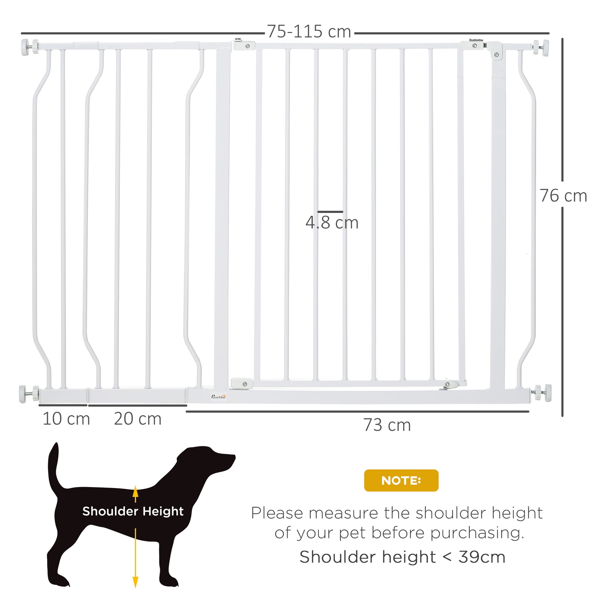 Need to keep pets away from certain places? This PawHut safety gate does the job. Suitable for hallways, doorways and staircases, it has an adjustable width of 75-115 cm – perfect for different sized openings. Made from durable steel, it stays firmly upright when in use – it can also be pressure-mounted, making it easy to set up; a safe and effective way to stop pets from going where they shouldn't.