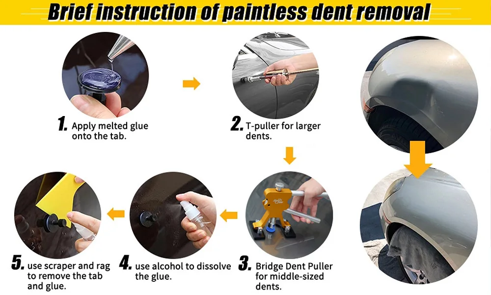 Note 1: Our tools cannot be used for vehicles that have undergone sheet metal painting. Since the adhesive is a hot melt glue, it is recommended to use high-concentration alcohol to remove the adhesive, which can easily eliminate any residue. Additionally, due to shipping constraints, this kit does not include alcohol. We appreciate your understanding.
