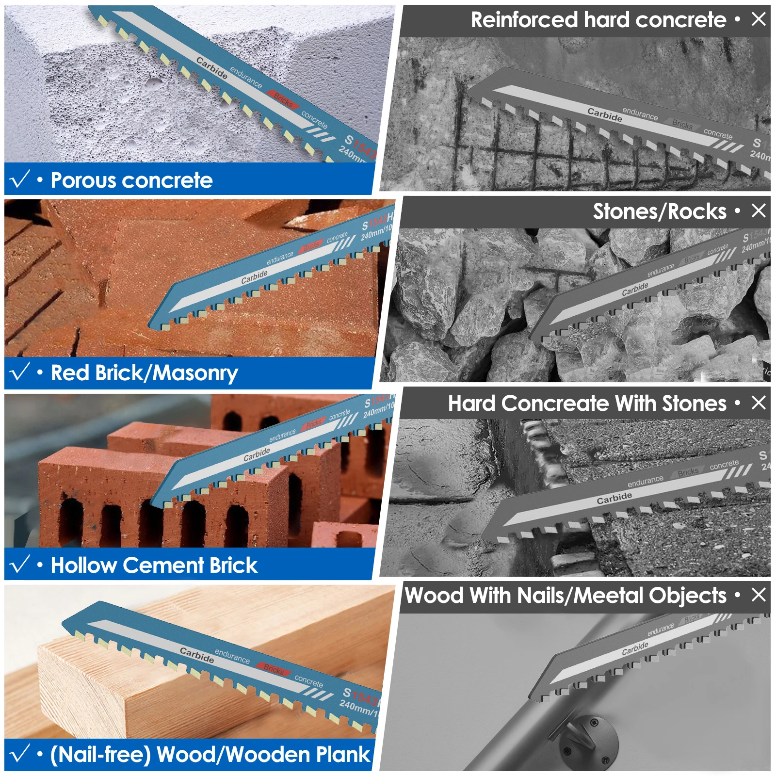 [Suitable for Various Materials] This reciprocating saw blade with universal shank is designed for masonry applications, which is suitable for cutting a variety of building materials including brick, porous concrete, aerated concrete, lime sand bricks, cement composite panels. It can cut wall, insert new doors and windows, and dismantle old parts. Note: This product can cut cement brick, but cannot cut concrete with stones