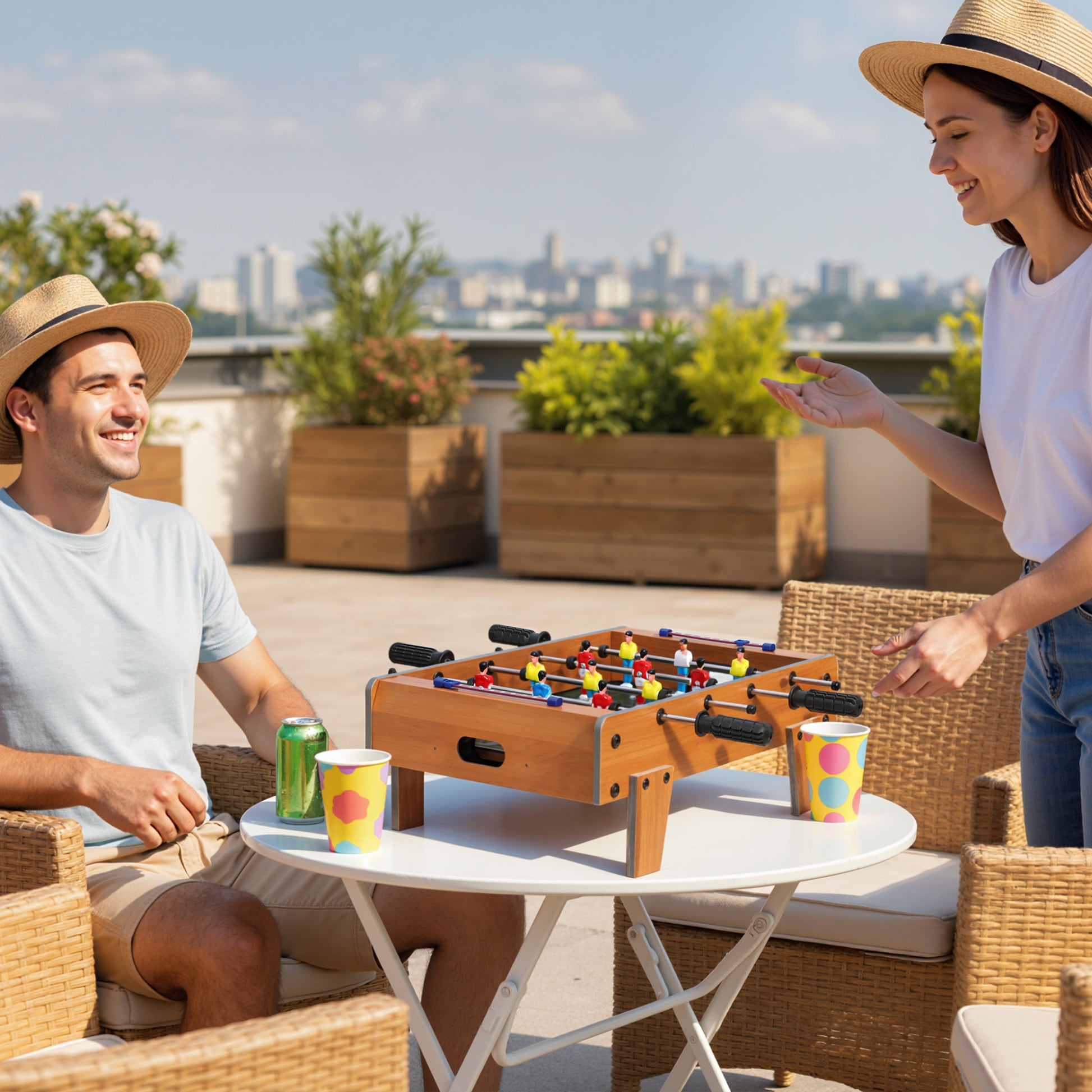 - Table-top design turns any space into a stadium