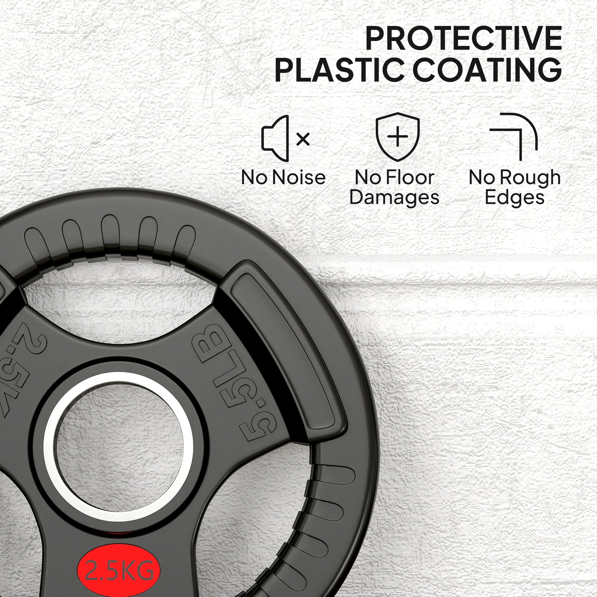 These SPORTNOW 2 x 2.5 kg Olympic weight plates are made from solid steel and feature a PVC coating for corrosion resistance, noise reduction and floor protection. Designed with three cut-out grip holes for easy handling, they fit all Olympic barbells with a 2" collar opening. Clear KG markings ensure easy identification and the versatile plates can also be used for a variety of exercises beyond barbell training.