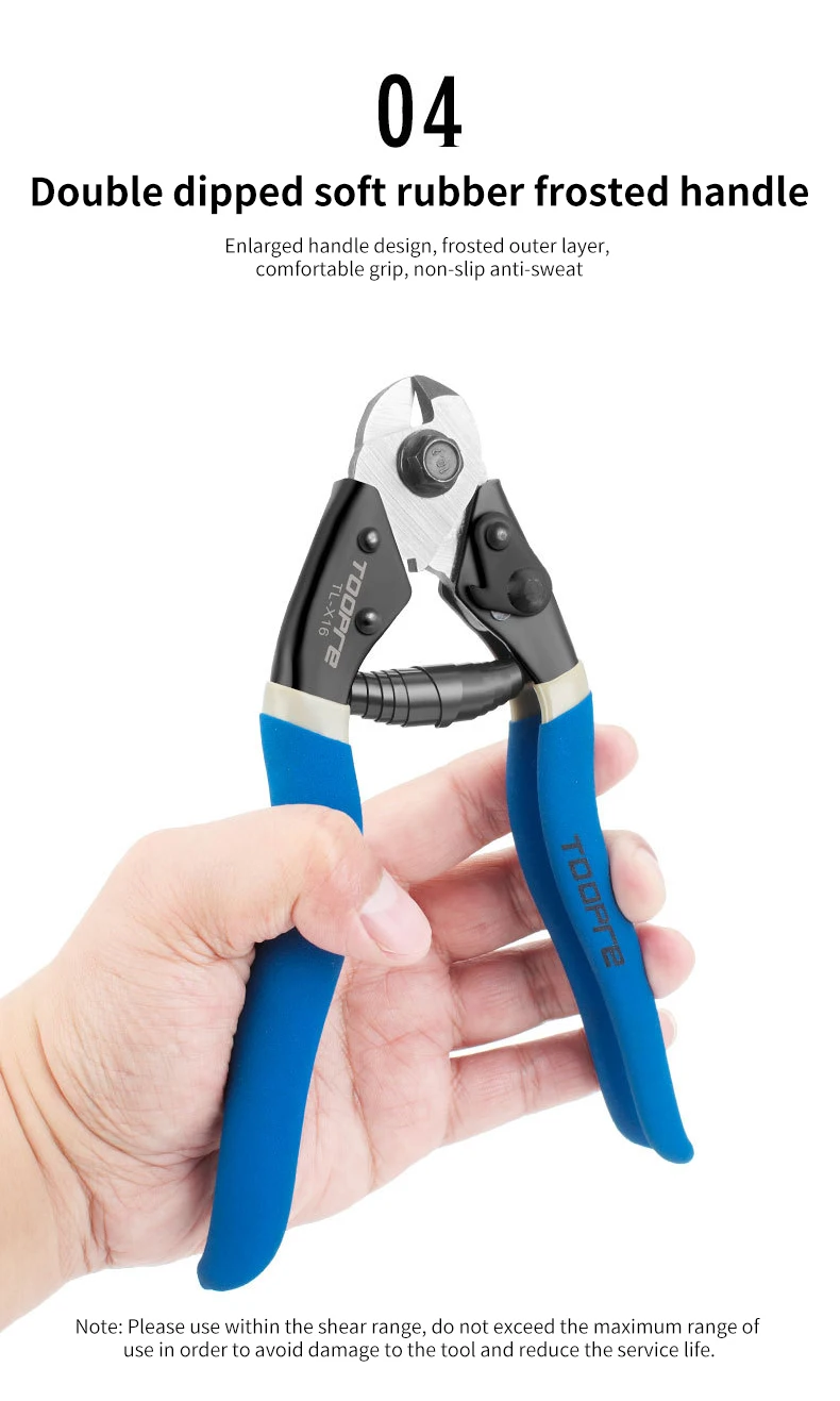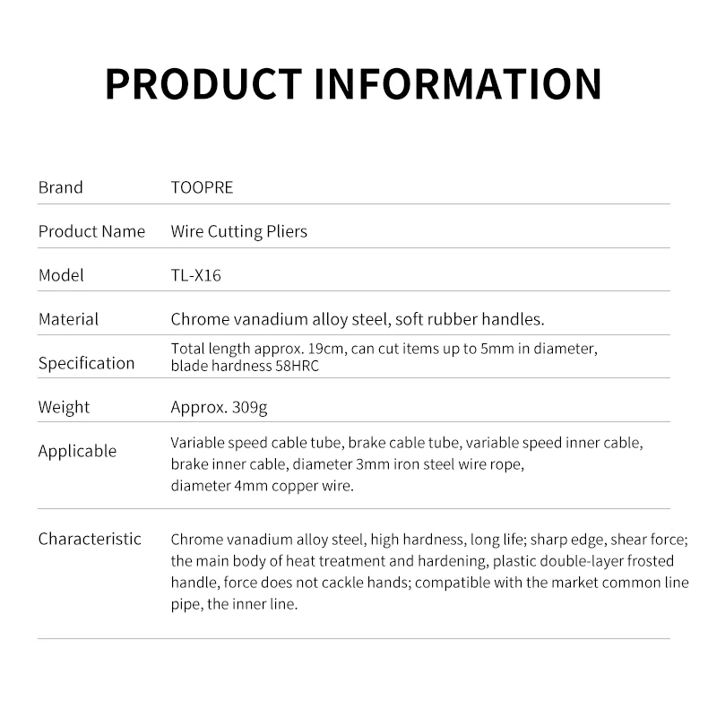 Chromium vanadium alloy steel, high hardness, long service life; Sharp edge, effortless cutting; Hardening heat treatment, plastic wrapped handle, no discomfort when exerting force; Universal bicycle line pipe and inner line cutting.