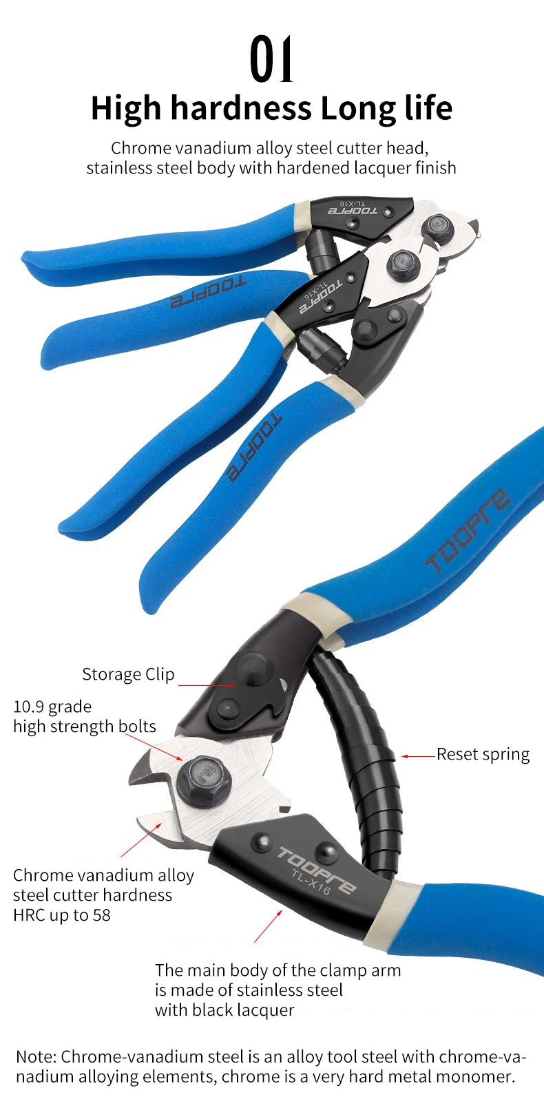 Chromium vanadium alloy steel, high hardness, long service life, sharp cutting edge, effortless cutting, hardened heat treatment, double-layer plastic wrapped handle, non clutching force, universal bicycle line pipe and inner line cutting.