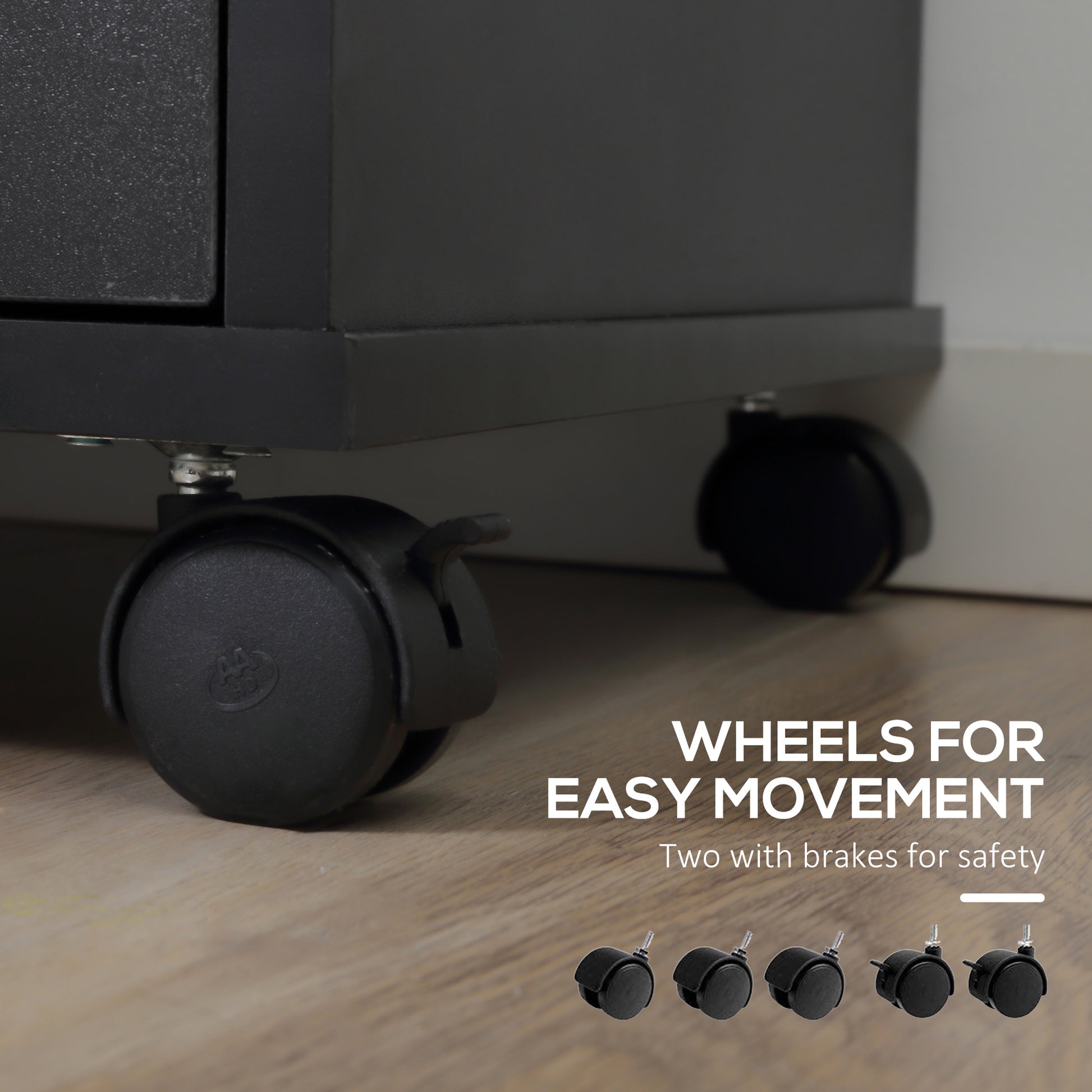 Organise your office thanks to this HOMCOM printer table with file cabinet. It comes with two shelves, top drawer and bottom drawer for holding plenty of files, folders and stationery. The top is flat and spacious enough for a printer. Four castor wheels to move it around easily - two can be locked. The bottom drawer is lockable for security - with two keys included.